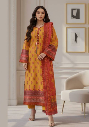 The outfit features a beautifully detailed printed lawn shirt, paired with a matching printed lawn dupatta that adds graceful flow, and a complementing trouser for a polished, balanced look. The vibrant prints and soft lawn texture ensure all-day comfort while maintaining a sophisticated appearance.