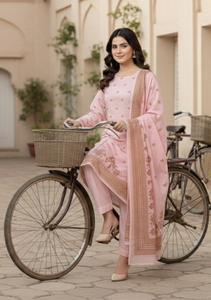 The suit includes a perfectly coordinated printed dupatta that enhances the overall look with grace and charm, along with a finely tailored trouser that ensures a sleek and flattering fit. Whether for casual outings, family gatherings, or semi-formal occasions, this 3-piece set delivers a flawless blend of tradition and contemporary fashion.