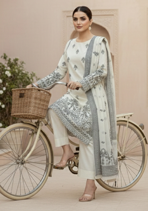 The suit includes a perfectly coordinated printed dupatta that enhances the overall look with grace and charm, along with a finely tailored trouser that ensures a sleek and flattering fit. Whether for casual outings, family gatherings, or semi-formal occasions, this 3-piece set delivers a flawless blend of tradition and contemporary fashion.