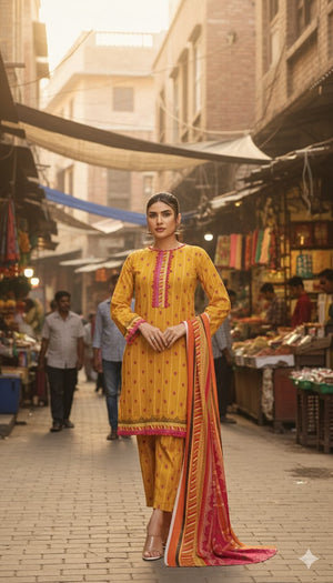Wrap yourself in summer luxury with this 3pc Malai Printed Suit, paired with a warm and elegant Printed Voil Duppata. Designed for ultimate comfort in cold weather, this outfit blends rich prints, soft textures, and timeless summer charm.