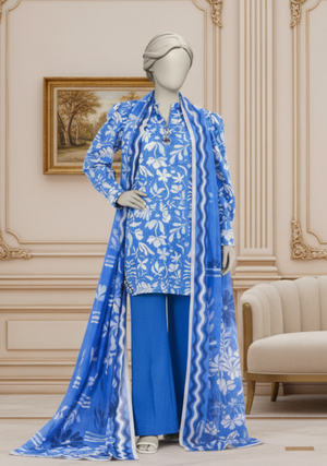 This beautifully designed 3-piece set includes a finely printed shirt with intricate floral and traditional patterns, a matching printed trouser, and a stylish dupatta that completes the look with grace. The vibrant colors and detailed prints make it ideal for casual wear, family gatherings, and festive occasions.