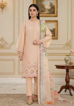 This elegant 3-piece set features a beautifully embroidered shirt with delicate stitching and refined craftsmanship, paired with a matching trouser and a stunning printed zari dupatta that adds a rich, festive charm to the ensemble. The combination of embroidery and zari detailing gives this suit a luxurious yet modern appeal, making it ideal for casual gatherings, festive events, and special occasions.