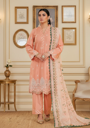 This elegant 3-piece set features a beautifully embroidered shirt with delicate stitching and refined craftsmanship, paired with a matching trouser and a stunning printed zari dupatta that adds a rich, festive charm to the ensemble. The combination of embroidery and zari detailing gives this suit a luxurious yet modern appeal, making it ideal for casual gatherings, festive events, and special occasions.