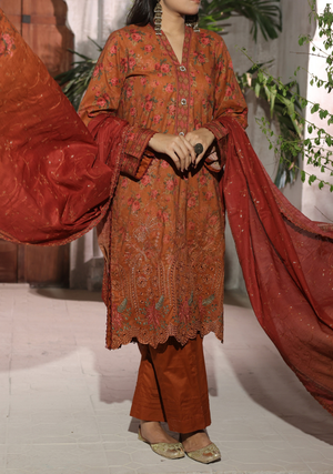 The breathable lawn fabric ensures all-day comfort while maintaining a sophisticated drape and flawless finish. The beautifully embroidered shirt is complemented by a matching dupatta and a well-tailored trouser, making it an ideal choice for casual wear, festive occasions, and summer gatherings.