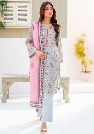 Enhance your seasonal wardrobe with the Salina Ladies 3PC Printed Lawn Suit, designed for women who value elegance, comfort, and premium detailing. This stylish three-piece ensemble features a beautifully crafted printed lawn chamki shirt, paired with matching trousers and a soft, flowy voil dupatta, creating a complete and graceful look for every occasion.