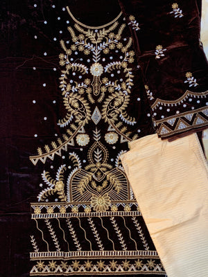 Step into luxury with Bin Inam’s Embroidered Velvet Collection — a perfect blend of opulence and artistry. Crafted from premium velvet, this 2-piece unstitched suit radiates timeless elegance. Intricate thread embroidery enhances the plush texture, creating a look that’s rich, graceful, and made for winter evenings.