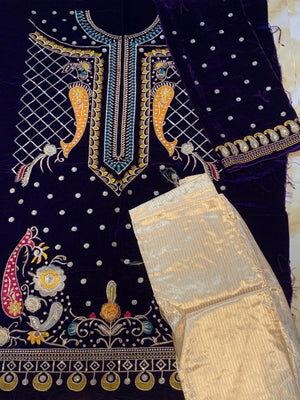 Step into luxury with Bin Inam’s Embroidered Velvet Collection — a perfect blend of opulence and artistry. Crafted from premium velvet, this 2-piece unstitched suit radiates timeless elegance. Intricate thread embroidery enhances the plush texture, creating a look that’s rich, graceful, and made for winter evenings.