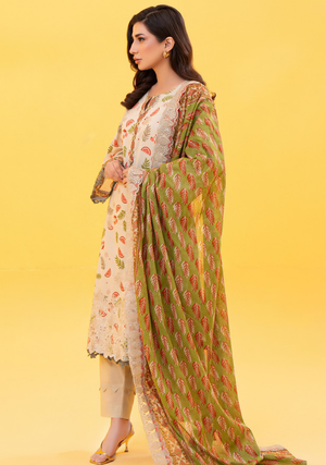 This beautiful 3-piece set features a finely embroidered shirt with delicate and detailed stitching, paired with a matching trouser and a graceful dupatta that completes the sophisticated look. The high-quality embroidery adds a luxurious touch, making this suit ideal for casual outings, family gatherings, and festive occasions.