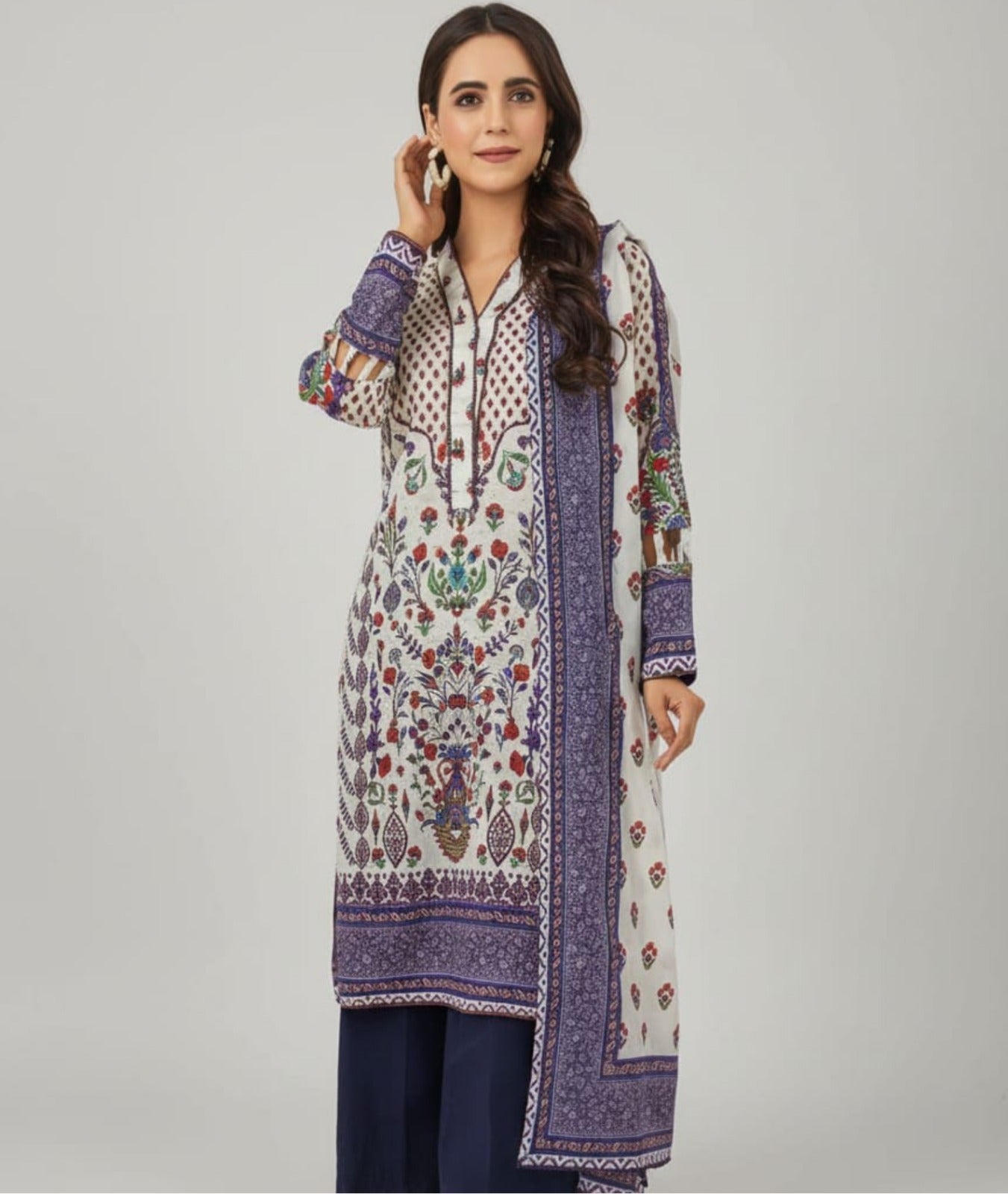 Experience refined elegance with BANARSI by BIN INAM, a collection designed to bring heritage beauty into your everyday style. This 3-piece suit includes a vibrant Printed Lawn Shirt, a lightweight Printed Lawn Voil Dupatta, and a soft Plain Dyed Trouser, creating the perfect balance of tradition and comfort.