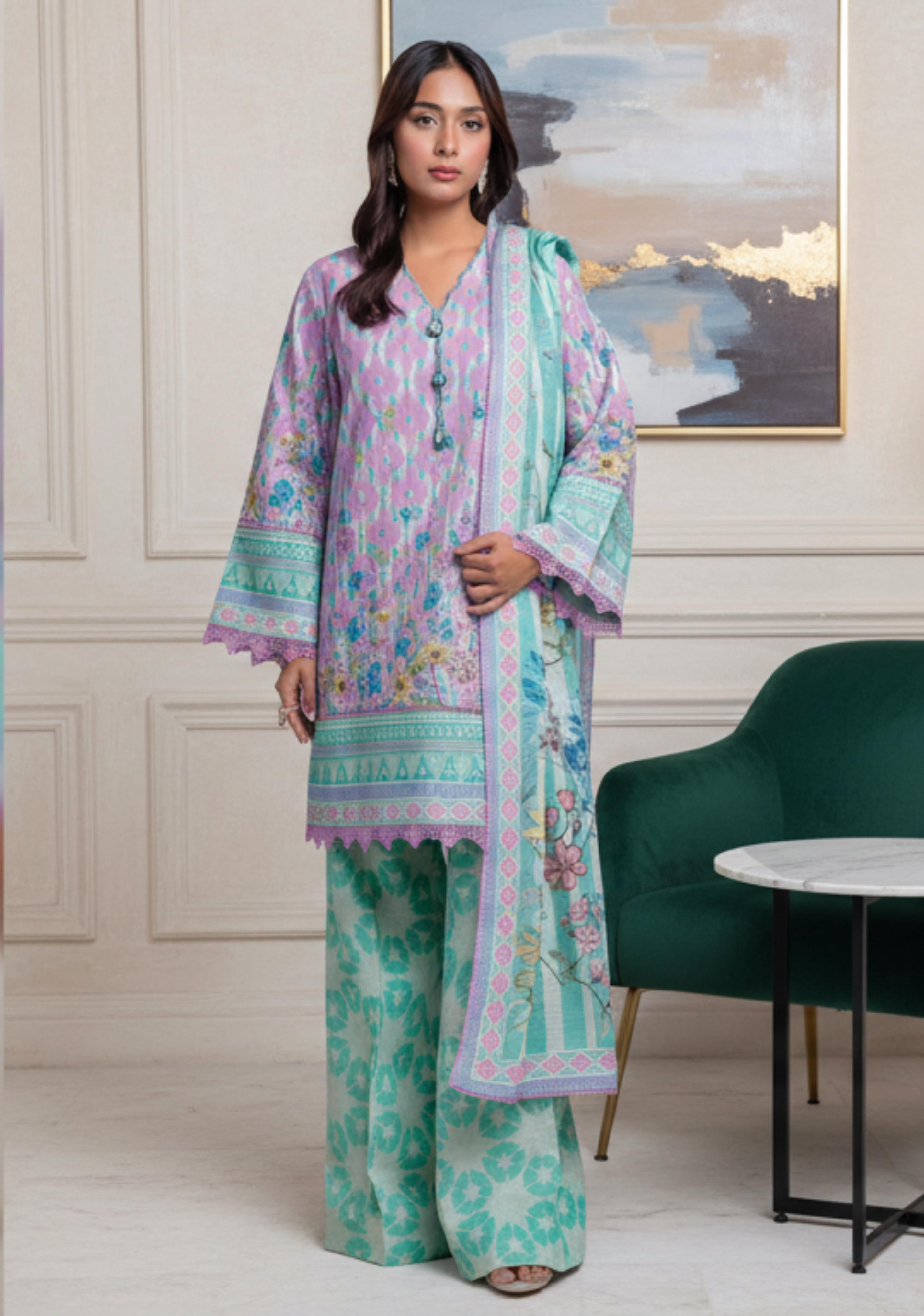 The allover printed lawn shirt reflects Bonanza Satrangi’s signature aesthetic—clean patterns, elegant color palettes, and premium finishing—making it a perfect choice for casual outings, office wear, and daytime gatherings. The lightweight lawn fabric ensures all-day comfort, while the airy voil dupatta adds a soft, elegant drape that completes the outfit effortlessly.