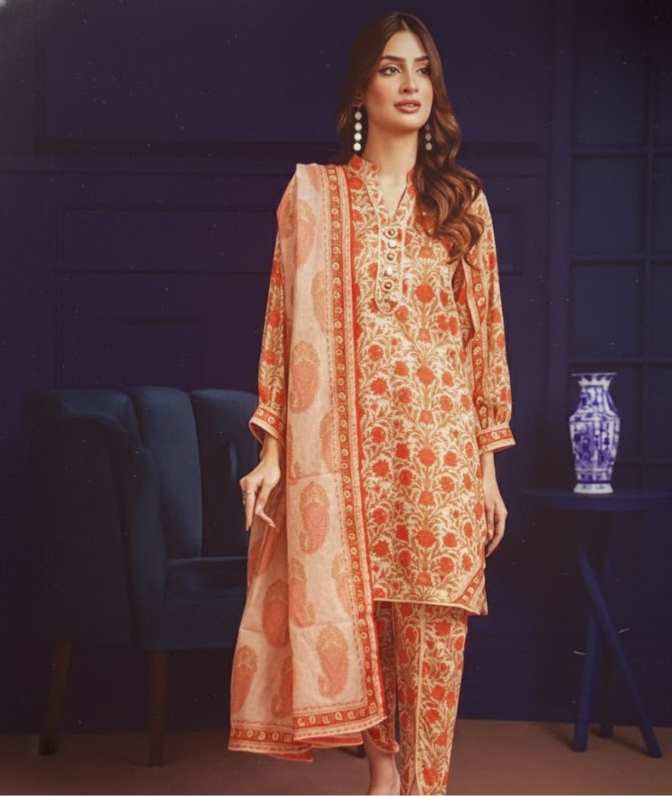 Bring color, charm, and comfort to your summer wardrobe with BIN INAM’s Rangoli Collection. This elegant 3-piece unstitched lawn suit features a vibrant Printed Lawn Shirt, paired with a Printed Lawn Voil Dupatta for a breezy, luxurious feel. Completing the look is a beautifully crafted Printed Trouser / Dyed Trouser option, giving you the freedom to style it your way.