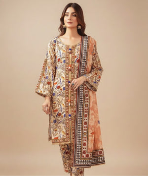 Bring color, charm, and comfort to your summer wardrobe with BIN INAM’s Rangoli Collection. This elegant 3-piece unstitched lawn suit features a vibrant Printed Lawn Shirt, paired with a Printed Lawn Voil Dupatta for a breezy, luxurious feel. Completing the look is a beautifully crafted Printed Trouser / Dyed Trouser option, giving you the freedom to style it your way.