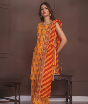 Bring color, charm, and comfort to your summer wardrobe with BIN INAM’s Rangoli Collection. This elegant 3-piece unstitched lawn suit features a vibrant Printed Lawn Shirt, paired with a Printed Lawn Voil Dupatta for a breezy, luxurious feel. Completing the look is a beautifully crafted Printed Trouser / Dyed Trouser option, giving you the freedom to style it your way.